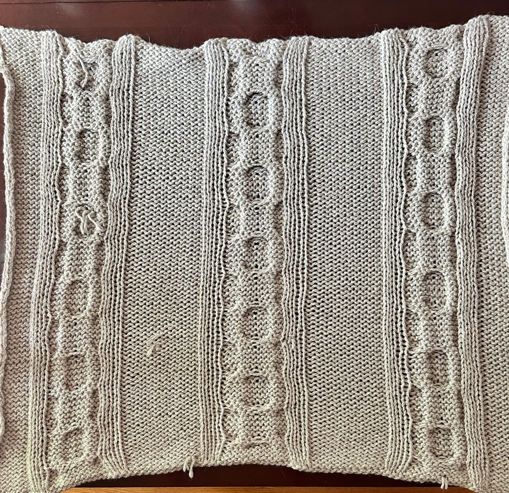 - Use the Mattress Seam Stitch to seam the stitches from the inside edge towards the outside, leaving an opening for the sleeves as indicated in the pattern.