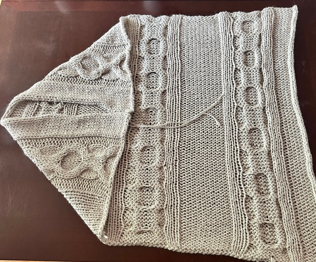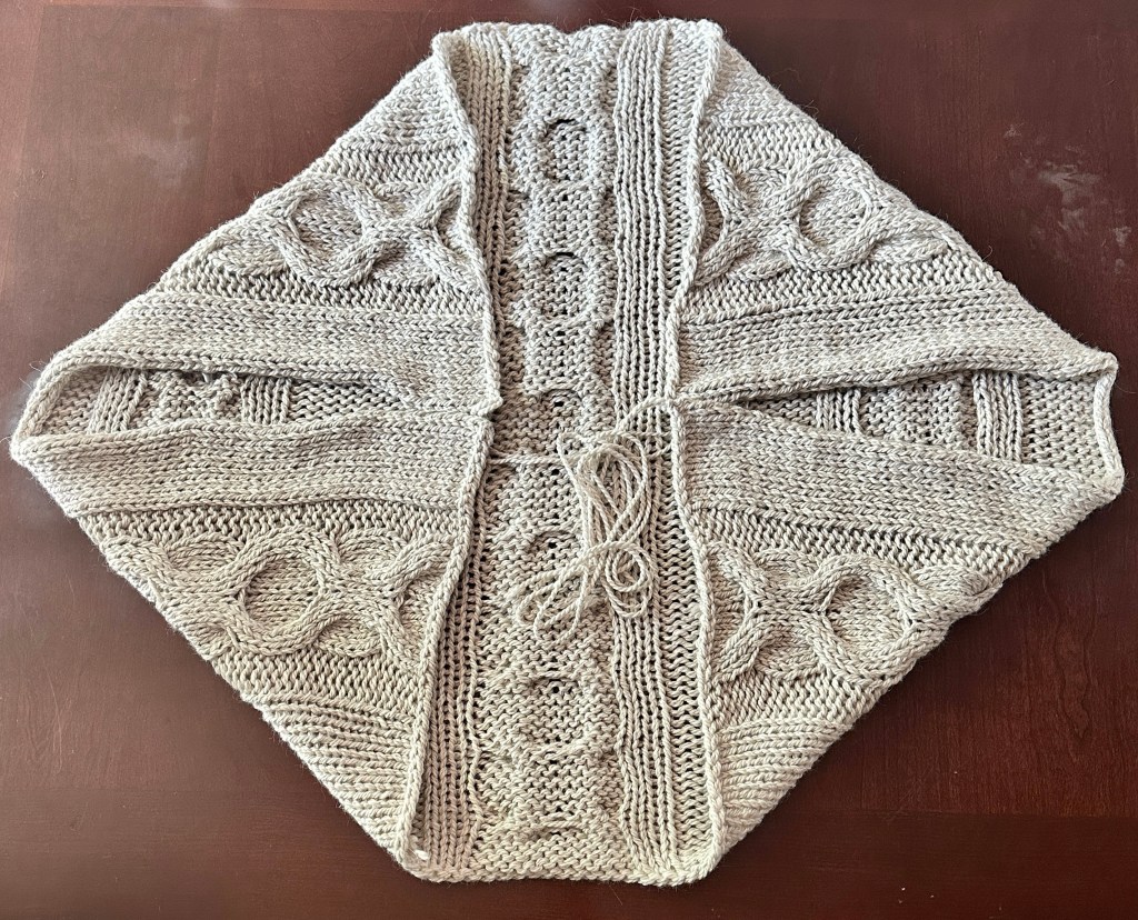 The Sweetheart Cardi is a cozy blanket cardigan knitted in super bulky weight yarn. It’s quick, warm, and perfect for snuggling up in. The pattern includes a diagram and specific stitch counts for folding and seaming the cardigan, but I believe a photo tutorial would be really helpful for the process.