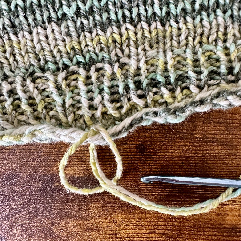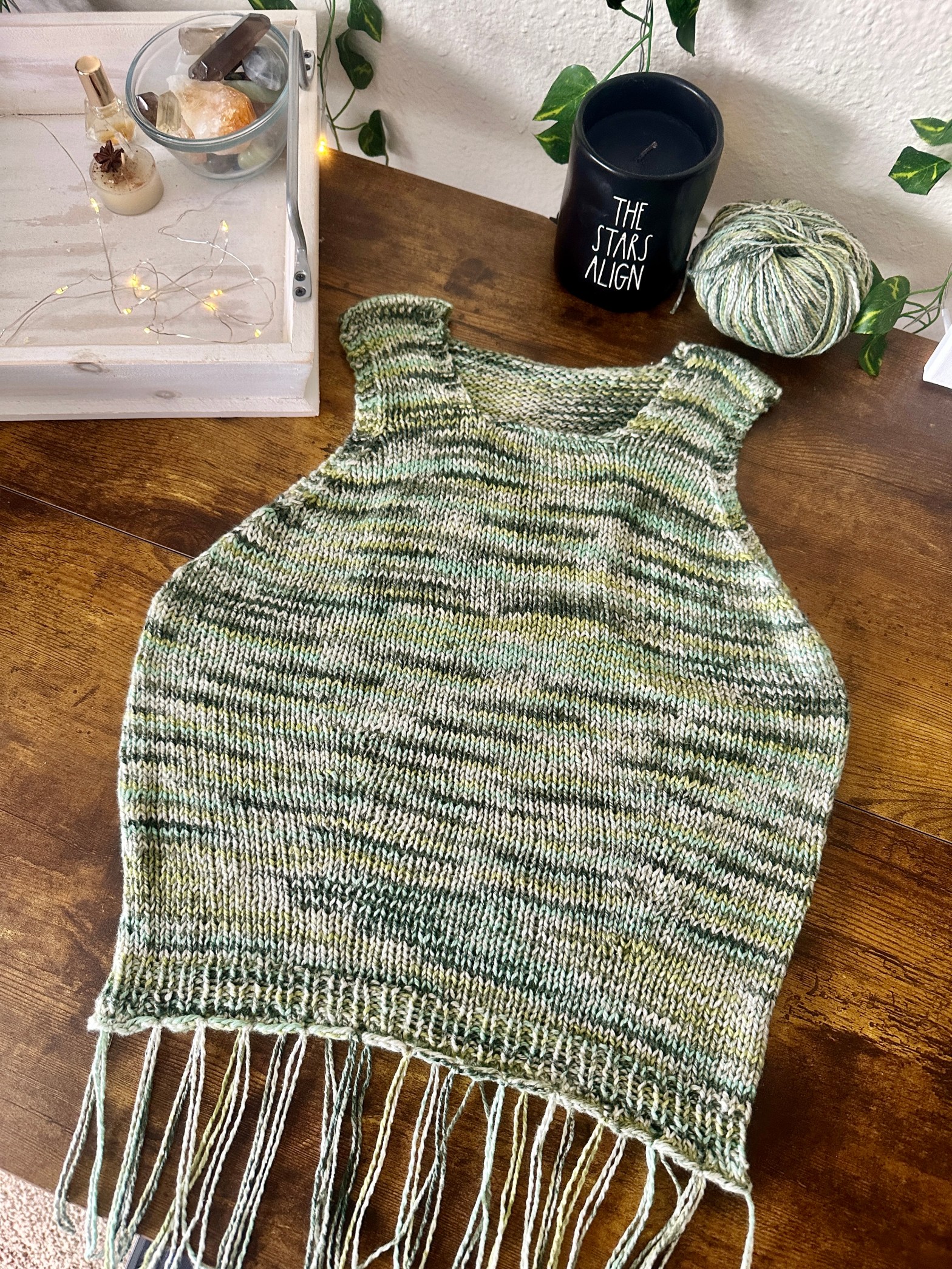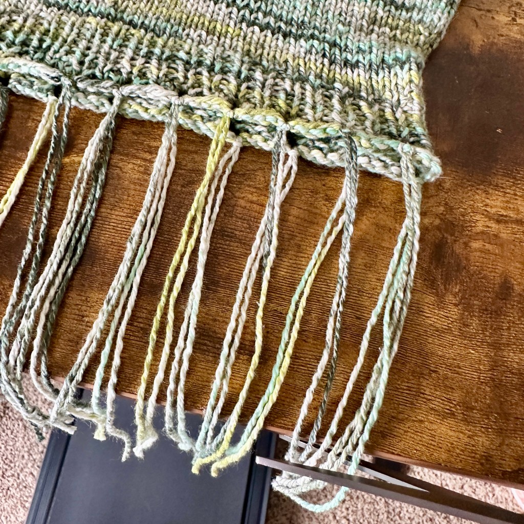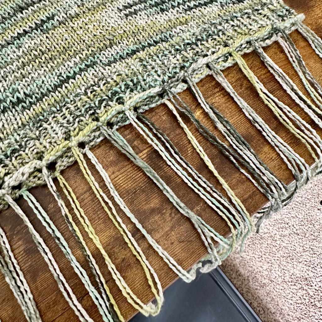 4. Once all the fringe is attached, lay the garment flat on a table and let the fringe hang off the edge of the table, ensuring that the table edge is straight and parallel to the bottom of the garment.